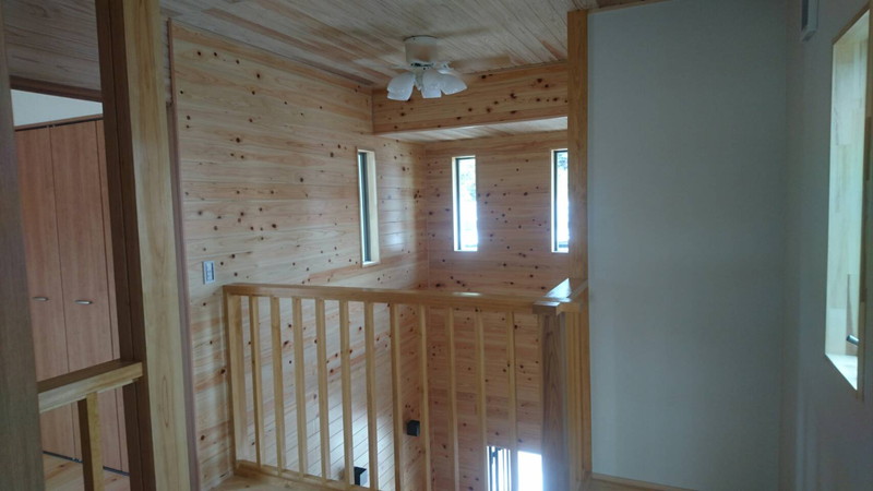 玄関は吹き抜けになっており、スリット窓からの光でとても明るく気持ちのいい場所になりました。壁の材は「桧の生き節」という希少なものを使っています。