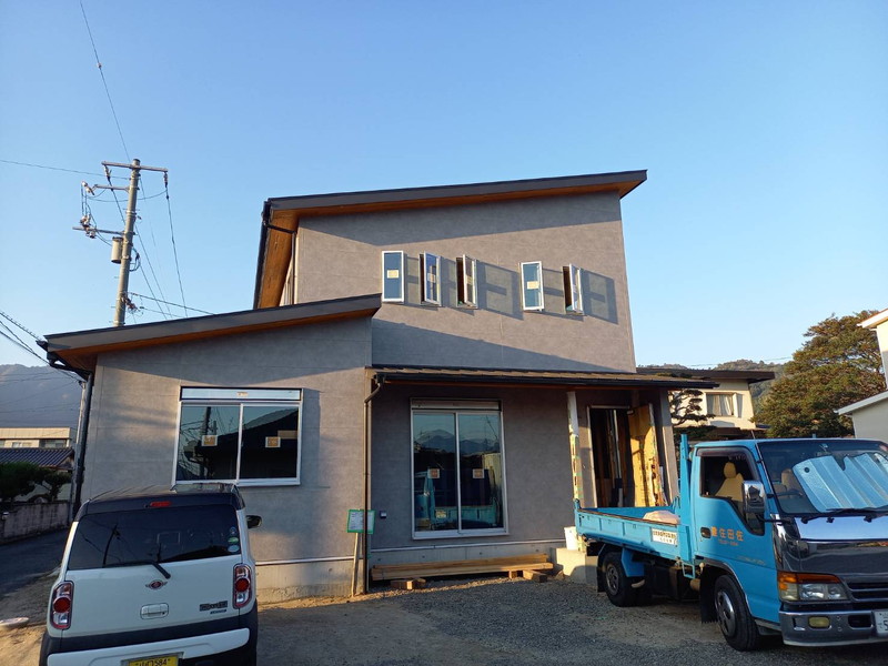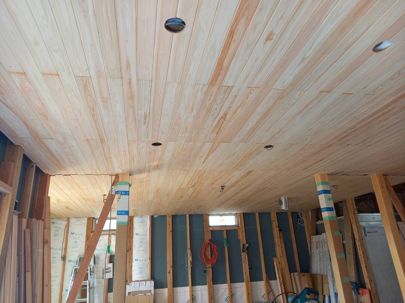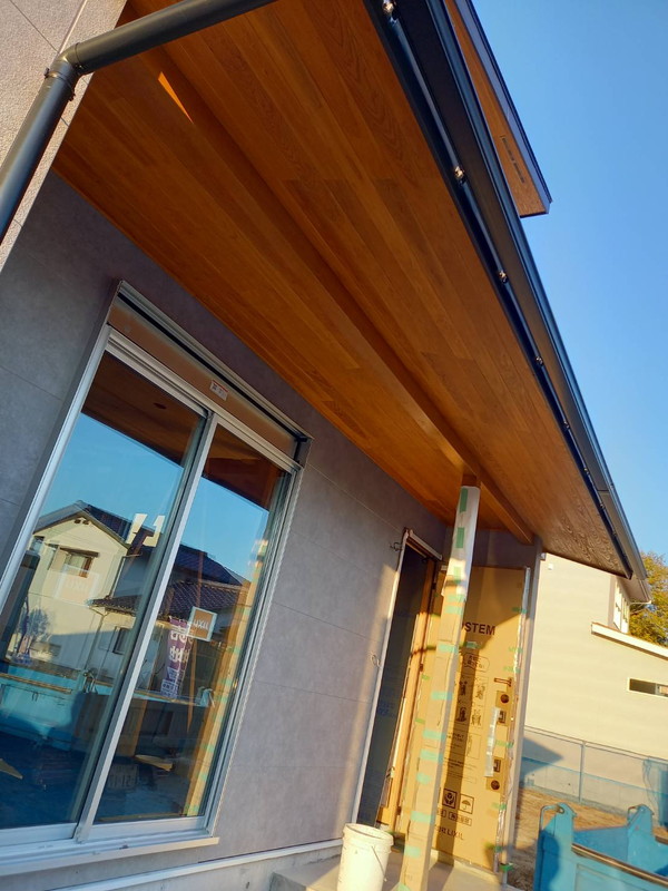 外壁完成して足場が外れました。軒天の木目とグレーの外壁が相性抜群です。室内の天井も板張りです。