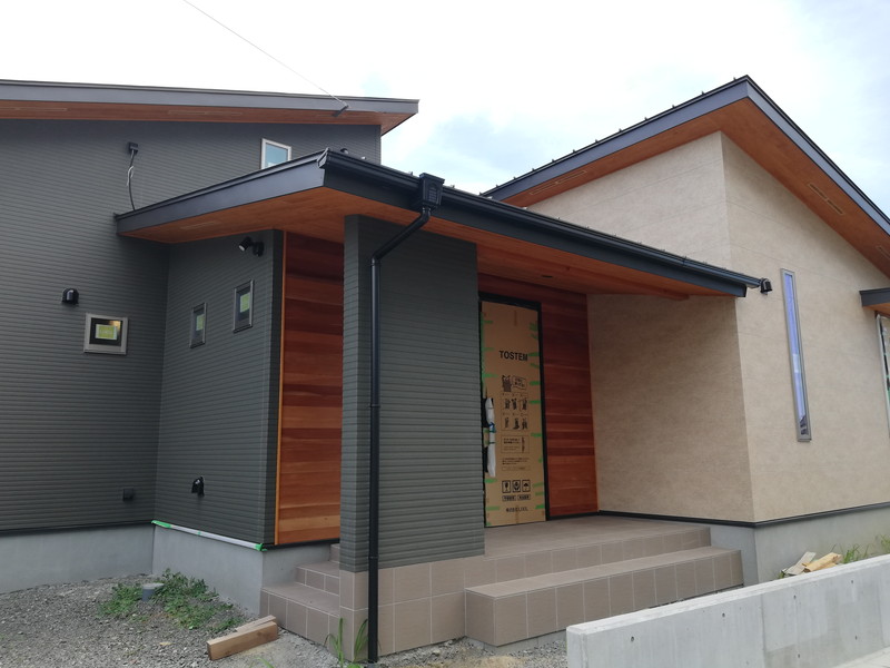 外壁はサイディングで、玄関周りは板張りです。グレーのサイディングと無垢板の相性が良く、軒天の板張りとの繋がりもいい感じです。