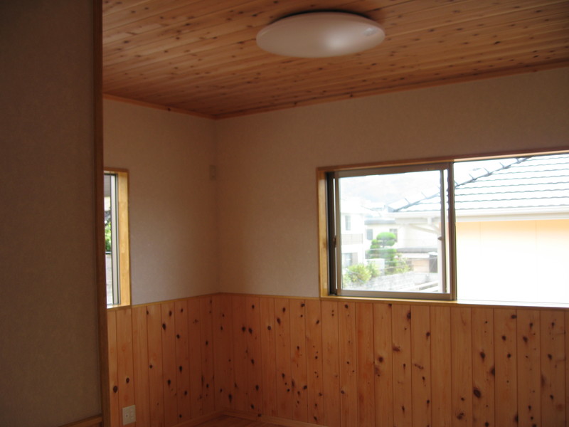 部屋は全部屋、無垢材のフローリングを使っています。壁は腰壁に桧の板を使い、天井は杉の板を使いました。 無垢材に囲まれた部屋は温かみがあり落ち着ける空間です。