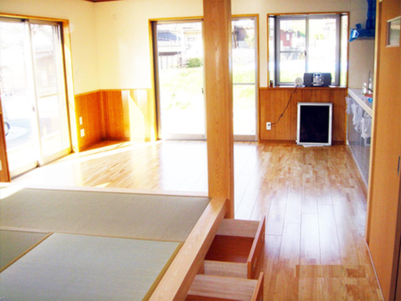 ダイニングの一角に4畳半の和室をもってきました。 和室は一段高くして引き出しの収納を作りました。